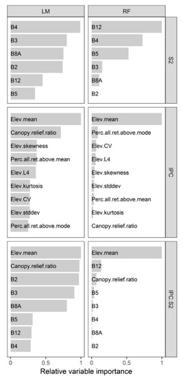 Analysis of relative variable importance showed that depending on the applied regression method, LM or RF, different predictor variables were found to be most robust (Figure 6). Only the Elev.mean variable showed the highest RVI value for both regression methods (IPC and IPC.S2 variable sets). In case of IPC-based models the Canopy.relief.ratio was found to be a robust predictor variable for the LM but not for the RF approach. In Sentinel-2-based models, B4 was shown to be an important predictor for both, the LM and the RF methods.