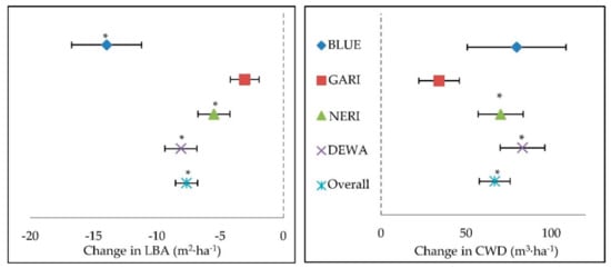 Canopy disturbance in preserved forests caused a reduction in live tree basal area and an increase in coarse woody debris from fallen trees and broken limbs. Canopy damage increases light penetrating the canopy, which has the potential to change the forest structure and species composition [