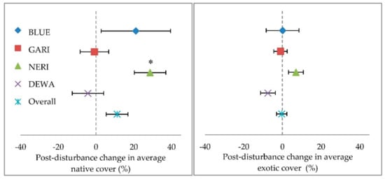 9]. However, exotic plant richness and cover in these disturbed forests did not increase relative to undisturbed forests in the three years following disturbance. Native plant cover and richness increased to a greater extent in response to canopy disturbance than that of exotic plants, though native plant cover change was highly variable between both disturbed and undisturbed plots.