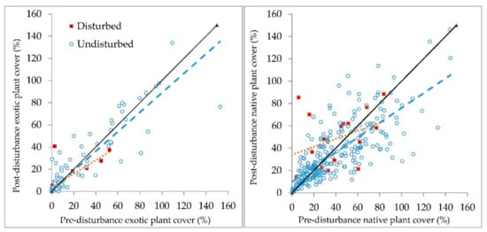 In contrast to exotic plant species in this study, native plants showed high temporal and spatial variability. For example, native plant cover in undisturbed plots measured before 2012 only explains 57% of the variance of native plant cover when the plots were resampled (