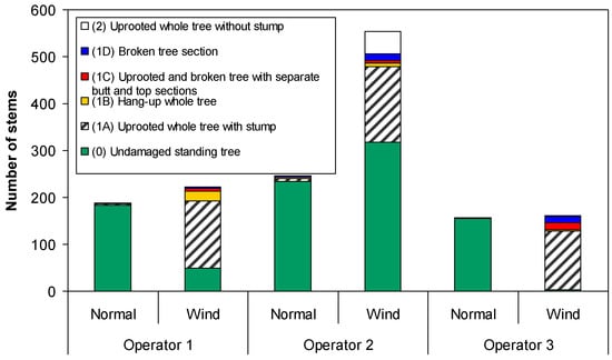 Number of stems (n = 1529) by damage type (see Table 2) and by harvester operator for the normal (undamaged standing trees) and windthrown (damaged trees) time-study plots.