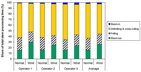 The processing time (i.e., delimbing and cross-cutting) took most of the total stem processing time. The share of processing time from the total stem processing time was, on average, 61.1% in the normal clear-cutting stands of undamaged standing trees (Figure 2). At the clear-cutting sites of windfalls, the processing time took, on average, 53.3% of the total stem processing time.