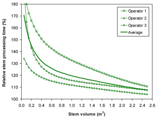 Relative stem processing time in windfall clear cutting by operator and on average as a function of stem volume. Relative stem processing time 100 = stem processing time in normal clear cutting with undamaged standing trees.