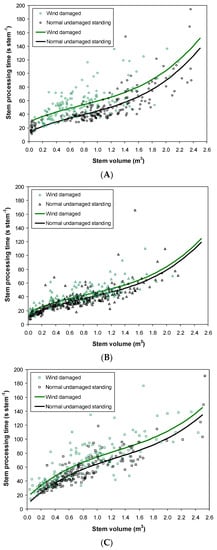 Stem processing time curves as a function of stem volume by operator with the wind damaged (n = 516) and normal undamaged standing (n = 572) trees in clear cutting. (A) Operator 1, (B) Operator 2 and (C) Operator 3.
