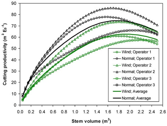 Cutting productivity in clear-cutting stands of wind-damaged and normal undamaged standing trees as a function of stem volume by operator and on average (cf. Table A2). The density of removal was 450 stems ha−1.