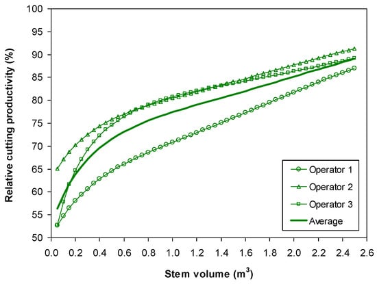 Relative cutting productivity in windfall clear cutting as a function of stem volume by operator and on average. Productivity 100 = cutting productivity in normal clear cutting with undamaged standing trees. The density of removal was 450 stems ha−1.