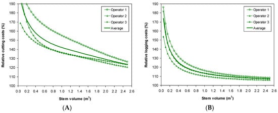 Relative cutting (A) and logging (B) costs in windfall clear cutting as a function of stem volume by operator and on average. Cost 100 = cutting/logging costs in normal clear cutting with undamaged standing trees. The density of removal was 450 stems ha−1.