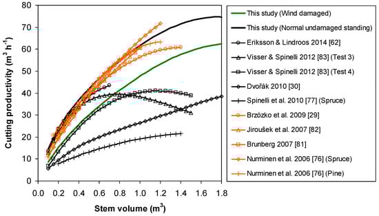 Cutting productivity curves of undamaged standing trees as a function of stem volume presented by some selected studies in the 21st century. All stem volumes and productivities are over bark figures. The productivities by Brunberg [81] and Spinelli et al. [77] are the operating hour productivities (m3 E15−1), and the rest of the cutting productivity curves are the effective hour productivities (m3 E0−1).