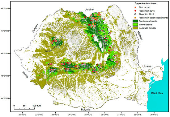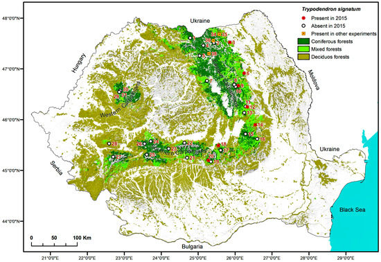 To determine the species distribution of T. laeve in Romania, in the spring of 2015, with the help of field forestry personnel, 78 pheromone traps were placed in 31 locations situated along the Carpathian Mountains chain (Table 1).