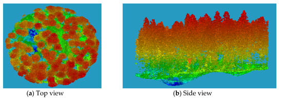 For all study plots, ALS data, DTM, as well as reference data were available in NEWFOR project, and the detailed data used in this article can be downloaded from its website [25]. Since the dataset originates from different institutions, the size and shape of these experimental plots are different. Most of the twelve plots are 40 m in diameter, and some plots (i.e., 3, 10, 11, 12) are 50 m in diameter. For the sake of comparative analysis, this study normalized twelve plots to the same size of 40 m diameter. The 3D view of plot 10 ALS data is shown as an example in Figure 2, where the colour represents the height of point. Red indicates high, and green indicates low.