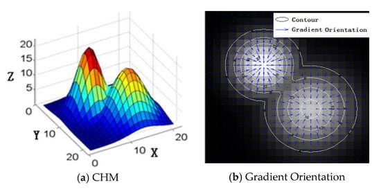 In this study, we proposed a novel and automatic method to detect single trees from ALS data through gradient orientation clustering. Like other single-tree detection algorithms (such as watershed [19,27,28], valley-following [29,30], and active contour model [31,32]), our method considers tree canopies as a mountain-like 3D topographic surface in the rasterized CHM, as shown in Figure 3a. The gradient orientation of each point was calculated from the CHM. The gradient orientation of most points moves towards the local maxima in rasterized CHM, as shown in Figure 3b. If it starts from any point in rasterized CHM and moves along the gradient orientation of each point, it eventually reaches the highest point, which is the local maxima point. All points that reach the same highest point are clustered into the same class. Therefore, the points in the same cones are clustered together.
