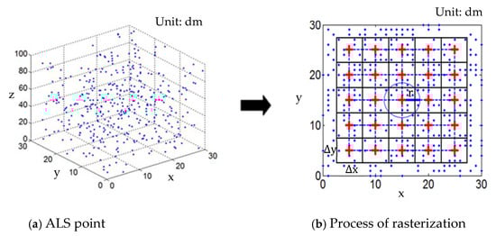 The point cloud in ALS data was irregularly distributed. However, the ALS height values can be summarized into regular grids. Figure 4 is an example of the process of rasterization ALS point cloud data to DSM. In this example, and are the length and width of the grid, respectively, and is the search radius of the rasterized pixels. There may be more than one point in the same search range. We set the value of the rasterized pixels to the maximum height values within the search range.