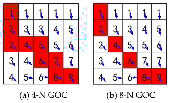 The gradient orientation clustering (GOC) algorithm is a procedure to find a path from one point to the last point of the cluster. According to the neighbour size, GOC can be divided into 4-N (4-Neighbour) and 8-N (8-Neighbour) GOC algorithms. Compared with Pseudocode of 4-N GOC, Pseudocode of 8-N GOC is only different in line 9 where