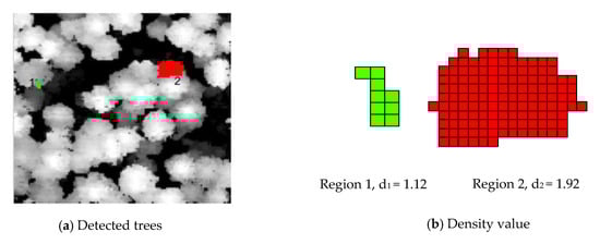 where res is the image resolution, and are two constants, and . A higher image resolution corresponds to a larger tree density in the image. Therefore, the appropriate and must be selected to obtain the threshold at different resolutions. is the initial value of a threshold, and . Use to adjust the threshold for different resolutions, where . When the density of the image object , the image object is considered a tree. For example, the density of region 2 in Figure 7a is 1.92, and the density of region 1 in Figure 7a is 1.12. Therefore, the object in region 2 is more likely a tree.