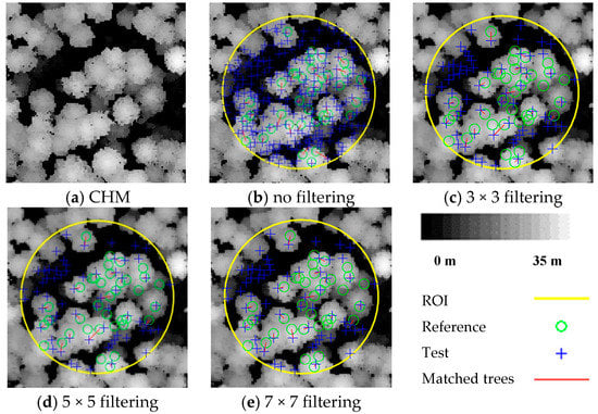 We have tried several filter-specifications such as 3 × 3, 5 × 5 and 7 × 7 filtering to smoothen the CHM. With the same window size, there is almost no difference in the performances for different values, so in our experiment we chose .