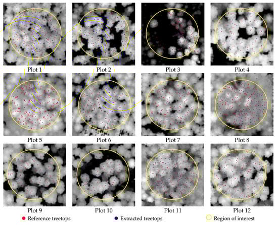This study conducted the proposed single-tree detection algorithm in twelve plots of approximately 20 metres in diameter, which belonged to multi-layered mixed forests (ML/M), multi-layered coniferous forests (ML/C), single-layered mixed forests (SL/M), and single-layered coniferous forests (SL/C), as shown in Table 1. Figure 9 illustrates the results of the extracted individual trees by the 4-N GOC method with 0.5 m CHM.