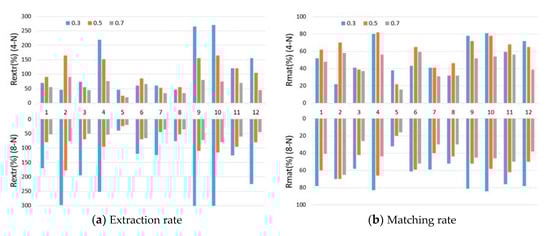 For the impact of density threshold T, we also took plot 10 as an example. Table 3 shows the matching results of plot 10 with Td of 0, 1.2, 1.4, and 1.6 respectively. The extracted number decreases quickly when the threshold increases, and the matched number decreases rarely. Simply said, the density threshold Td can help reduce the commission rate. Moreover, Rom does not increase with the same rate as Rcom decreases. Therefore, the matching score M by setting the density threshold Td will have better performance. When the threshold is within a certain range (1.2 to 1.6), the impact on the result is not significant.