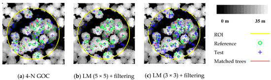 Figure 11a shows the matching results of 4-N GOC with 0.5 m resolution in plot 10 using 4-N GOC method. The extraction rate is 170%, the matching rate is 76%, the commission rate is 56%, the omission rate is 24%, and the matching score is 49. Figure 11b,c use the LM + filtering. In Figure 11b, the window size is 5, the extraction rate is 91%, the matching rate is 59%, the commission rate is 35%, the omission rate is 41%, and the matching score is 44. In Figure 11c, the window size is 3, the extraction rate is 329%, the matching rate is 81%, the commission rate is 75%, the omission rate is 19%, and the matching score is 46. The results show that the 4-N GOC method can provide superior results, whereas the LM + filtering method is strongly affected by the window size.