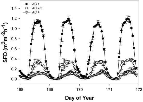 Sap flux density (SFD) of Fraxinus pennsylvanica trees during 26–30 June 2010 (AC1 = low infestation levels, AC 2 & 3 moderate infestation levels, and AC4 = high infestation levels). Error bars denote ±1 SE.