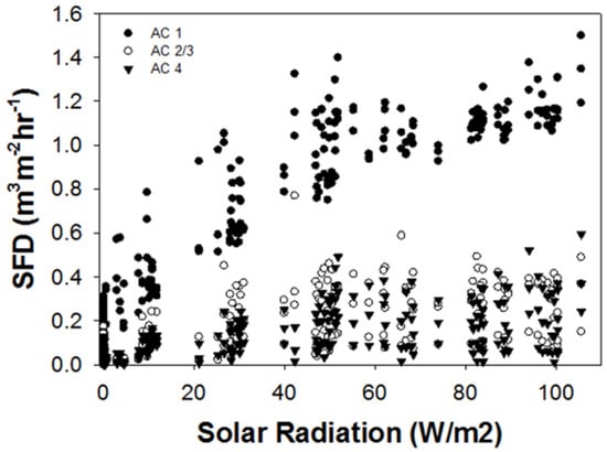 Half hourly sap flux density (SFD) of Fraxinus trees in relation to solar radiation (W/m2) during 26–30 June 2010 (AC1 = low, AC2/3 = moderate, AC 4 = high infestation levels).