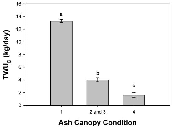 Mean daily sap flux (TWUD) across trees of different ash condition classes. Letters represent significance levels determined by Tukey’s HSD pairwise comparisons (p < 0.05), error bars denote ±1 SE.