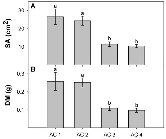 Leaf surface area (SA) (A) and leaf dry mass (DM) (B) in relation to ash tree canopy condition class (AC). Significance levels depict results of Tukeys HSD pairwise comparisons (p < 0.05).