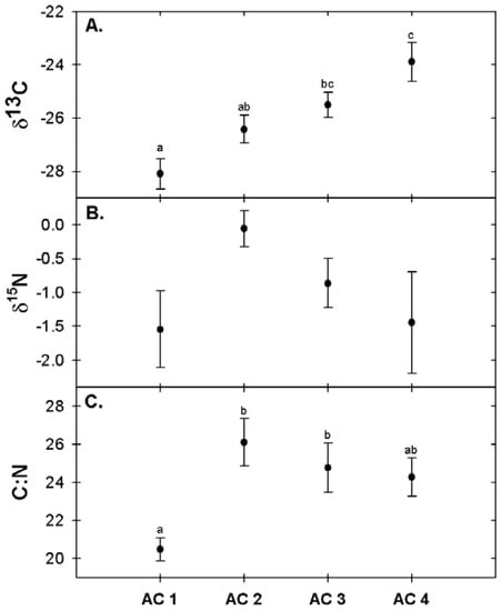 Leaf carbon isotopic signatures exhibited significant enrichment along with progressive canopy decline (Figure 5A; ANOVA; F (3,16) = 9.08, p < 0.001), while no significant differences were observed in the foliar nitrogen isotopic signatures (Figure 5B; ANOVA; F (3,16) = 2.152, p = 0.134). Bulk leaf carbon content generally increased as ash canopy condition increases. The carbon content of leaves in AC 1 was significantly lower than that of trees in AC 2 and AC 4 (Posthoc Tukey’s HSD p < 0.05; data not shown). Bulk leaf nitrogen content also exhibited variability across AC classes, although differences were less pronounced, and AC 1 was only different than AC 2 and AC3 (Posthoc Tukey’s HSD p < 0.05; data not shown). High foliar bulk N and low bulk C in the foliar tissue of trees in AC 1 largely led to the significant differences in leaf C:N ratios between AC classes (Figure 5C; ANOVA; F (3,16) = 6.241, p = 0.005).