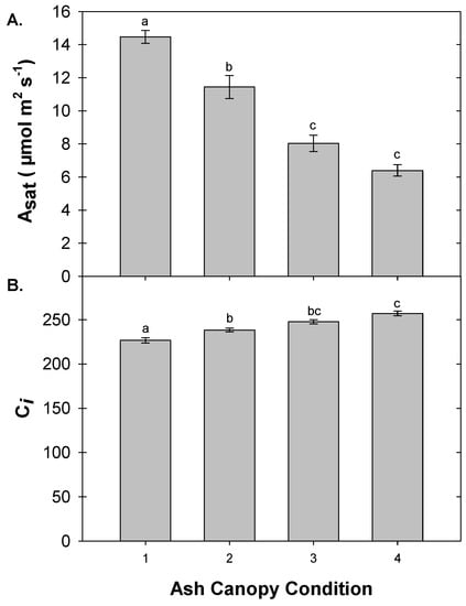 Mean light saturated photosynthetic rate (Asat; at 1600 PAR; panel (A)) and internal leaf CO2 concentration (Ci; panel (B)) across foliage from ash trees of different ash condition classes. Letters represent significance levels determined by Tukey’s HSD pairwise comparisons (p < 0.05), error bars denote ±1 SE.