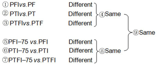 The abundance of miRNAs in the nine libraries was analyzed to obtain the DEMs related to PaWB. First, the DEMs in ① PFI vs. PF, ② PTI vs. PT, and ③ PTFI vs. PTF were compared. The same DEMs from these three comparisons were obtained ④. Then, the DEMs in ⑤ PFI-75 vs. PFI, ⑥ PTI-75 vs. PTI, and ⑦ PTFI-75 vs. PTFI were compared. Similarly, the same DEMs in these three comparisons were generated ⑧. Finally, ⑨ PaWB related to miRNAs were identified from the DEMs that intersected in ④ and ⑧ (Figure 1).
