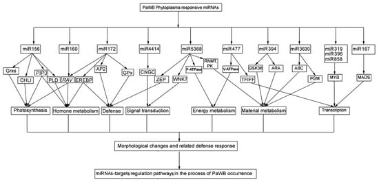 In this study, according to the comparison scheme of the miRNAs related to PaWB in the material section, a total of 76 common DEMs related to PaWB were generated, and 196 target genes were predicted by degradome sequencing. Of which, most DEMs targeted more than one target gene, and the same target gene may be cleaved by different DEMs. Through an analysis of the functions of the target genes in other transplant plants, we found that each target gene was involved in several physiological processes. These results, together with the results of previous studies, indicate that an integrated co-regulatory network exists in the pathological process of phytoplasma infection [23]. Based on an integrated analysis of the functions of the target genes of the DEMs in this study and the previous ones [23,51,52,53], we constructed a network that describes the regulation relationship of the DEM-mediated target genes in the manifestation of PaWB symptoms (Figure 3).
