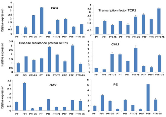 After the conserved and novel miRNAs were identified in the nine libraries, miRNA expression was calculated as follows. The standard measure of reads per kilobase per million (RPKM) was used to normalize gene expression, where 0 was normalized as 0.01 to facilitate calculation. Normalized expression = (Actual sRNA sequencing read counts/Total clean read counts) × 1,000,000. Then, miRNA expression in different comparisons (PFI vs. PF, PTI vs. PT, PTFI vs. PTF, PFI-75 vs. PFI, PTI-75 vs. PTI, PTFI-75 vs. PTFI) was calculated, and miRNAs with |log 1.2 fold change| ≥ 0.263 and adjusted p-value < 0.05 were considered as significantly differentially expressed miRNAs (DEMs) [31,32]. The fold-change was calculated according to the following equation: log1.2 fold changes = log 1.2 (normalized miRNA reads in treatment/normalized miRNA reads in control).
