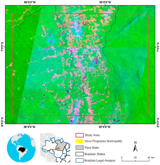 Our study site is located in the northern region of Novo Progresso municipality, State of Pará, Central Brazilian Amazonia, with an area of 30,000 km2 (3 × 106 ha) (Figure 1), which approximately corresponds to the area of Belgium. This region is known as a frontier of deforestation because of high rates of deforestation in the last 10 years. The vegetation is predominantly composed of the Dense Ombrophilous Forest, with trees that can reach heights up to 50 m [29].