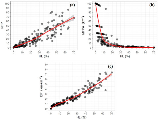 Landscape metrics as a function of Habitat Loss (HL): (a) relationship between Habitat Loss and Number of Forest Patches (NFP); (b) relationship between Habitat Loss and Mean of Forest Patches Areas (MFPA); and, (c) relationship between Habitat Loss and Edges Proportion (EP). Shaded areas represent 95% confidence intervals. The missing confidence intervals in some regions of the graphs are the result of the dispersion in the data at the upper end of the distribution.