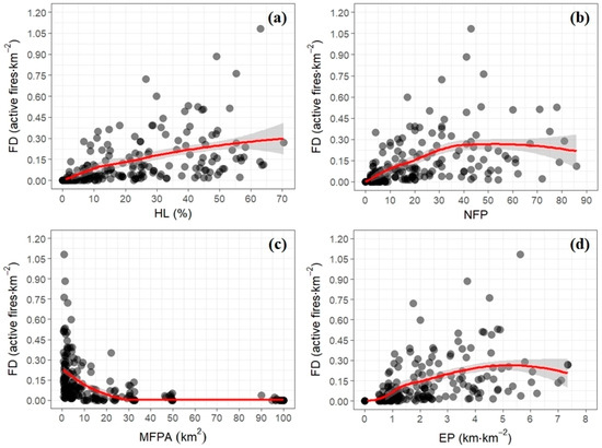 Fire density (FD) increased with habitat loss (HL), with greater variability in the higher levels of deforestation (Figure 3a). Furthermore, the FD increased until NFP reaches ~35 per grid cell, and then stabilized (Figure 3b). The FD decreased sharply up to 25 km2 of MFPA, tending to zero after that. On the other hand, the FD increased up to 5 km·km−2 of EP, after which it plateaus.