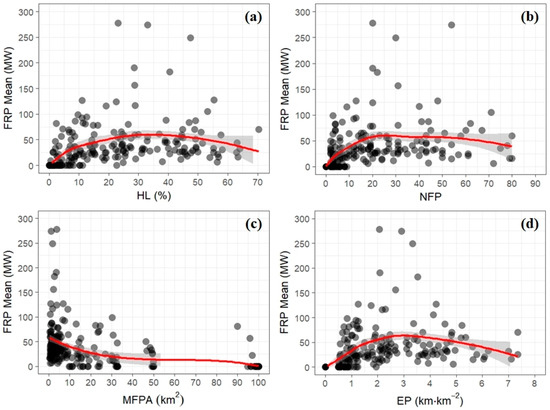 The Kruskal-Wallis test indicated that forest fire intensity (measured as mean FRP) was significantly lower at the lowest levels of fragmentation: 0–10% of HL (KW = 162.90; p-value < 0.05; Figure S4a), between 0–10 NFP (KW = 145.49; p-value < 0.05; Figure S4b), between 90–100 km2 of MFPA (KW = 204.28; p-value < 0.05; Figure S4c) and between 0–1 km·km−2 of EP (KW = 121.89; p-value < 0.05; Figure S4d).