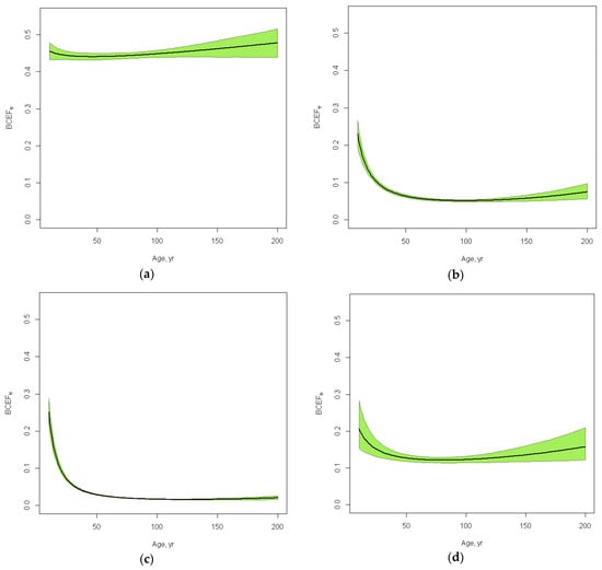 Estimated biomass conversion and expansion factors (BCEFs) with confidence envelops for (a) stem, (b) branches, (c) foliage and (d) roots in European Russia southern taiga pine forests depending on the stand age with a fixed SI = 21 m and RS = 0.7. In order to build the regression models, we have used 1000 sample plots for stem biomass, 983—for branches, 1038—for foliage and 308—for roots.