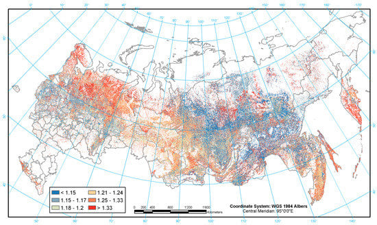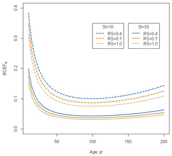 In contrast, this study estimated the BCEFs considering the site index and the tree density distributions of Russian forests. This is why the accuracy of the estimation reported here corresponds to the territorial specifics of the forest cover, which are reflected by the forest inventory data. The total carbon pools and emissions obtained by the BCEFs from this study might (or might not) differ considerably from the current ones [], but our BCEF models are generalizable, because, in additional to species, they take into account SI and RS composition.