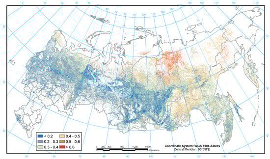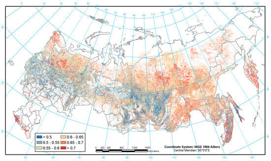 Relatively high values of the BCEF (Figure 3) for East Siberian forests are mostly related to larch forests with red areas indicating young forests (recently reforested burnt areas) and stone birch (Betula ermanii Cham.) in Kamchatka. The dark blue colors correspond mainly to boreal and temperate pine, spruce and aspen forests. Increased BCEF values in the southern European part of the study region are associated with birch, oak and beech forests. The northern European part of the study region also has relatively high BCEF values because of the dominance of either young or low productive forests.