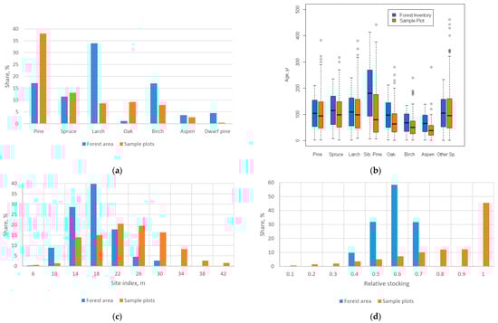 Discrepancy in sampling: (a) the amount of sample plots by dominant tree species, (b) the age by dominant tree species, (c) the distribution of sample plots by site index and (d) the relative stocking. Total amount of sample plots is 8007, forest area—763 million hectares.