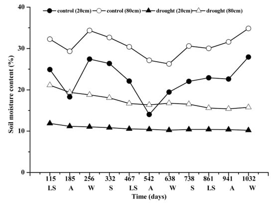 Then in the control treatment, soil moisture content at depths of both 20 and 80 cm showed significant seasonal fluctuations (p < 0.01; Figure 2). In the drought group, soil moisture content at depths of both 20 and 80 cm were significantly lower than that of the control group at day 115 (p < 0.01; Figure 2). The remaining study period (days 185–1032) showed very little fluctuation in soil moisture content (Figure 2).