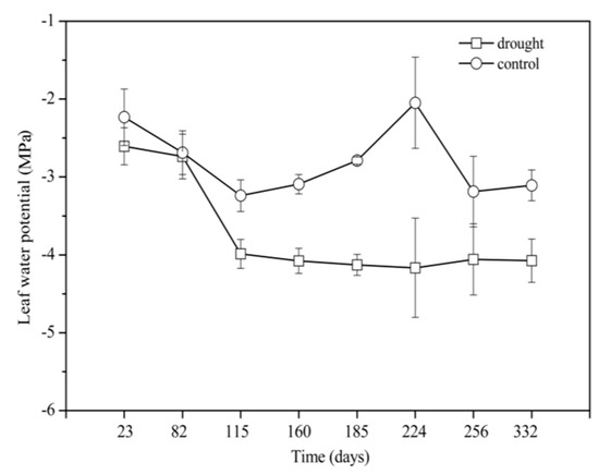 Soil moisture content differed between drought and control treatments. During the 1032 days of continuous monitoring, the soil moisture content at 20 and 80 cm depths of the control treatment was significantly higher than the corresponding soil moisture in the drought group, by 11.87% and 13.54%, respectively (Figure 2). Nevertheless, the average soil moisture content in the drought group, 10.69% at 20 cm depth and 17.31% at 80 cm depth, appeared to be able to meet the demands of a normal metabolism. We proposed two mechanisms to explain this phenomenon: (1) moderate slope limited the degree of drying due to below-ground flow; and (2) complete stomatal closure occurred under drought conditions at the beginning of the experiment. Overall, with 1737 mm annual rainfall at the study site, the experiment might be defined as mild drought [43]. Mild drought conditions are more representative of the real scenarios that are expected under natural conditions. In order to check the effects of rainfall exclusion on P. massoniana, leaf water potentials were analyzed. The effect of increasing drought on Ψd is seen in Figure 3. From April 2013 to March 2014, Ψd in the drought group decreased over the course of the experiment. The mean value of Ψd (−3.73 MPa) in the drought group was significantly lower than that in the control group (Ψd: −2.80 MPa) (p < 0.05; Figure 3), suggesting that soil water availability was different between different treatments.