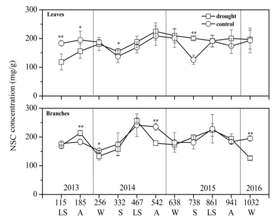 Non-structural carbohydrates (NSCs) in the leaves and branches of Pinus massoniana under control and drought treatments (mean ± SD). Samples were collected in late summer (LS), autumn (A), winter (W), and late spring (S) from 2013 to 2016. Variables marked with asterisks indicate a significant difference between the control and drought groups (** p < 0.01, * p < 0.05).
