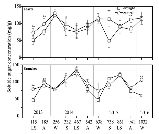 Soluble sugar concentrations in the leaves and branches of Pinus massoniana under control and drought treatments (mean ± SD). Samples were collected in late summer (LS), autumn (A), winter (W), and spring (S) from 2013 to 2016. Variables marked with asterisks indicate a significant difference between the control and drought groups (** p < 0.01, * p < 0.05).