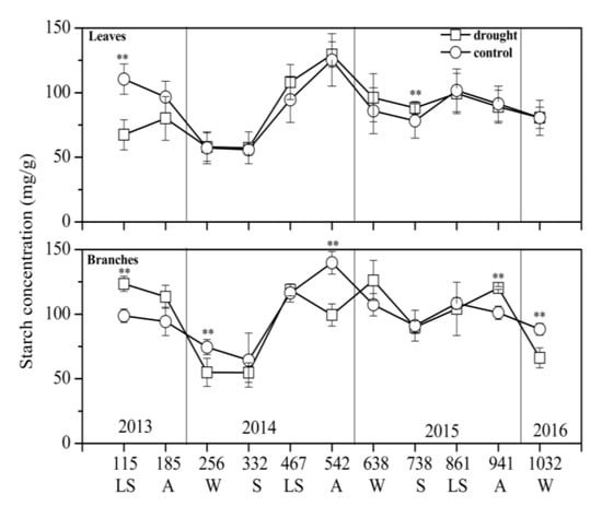 Starch concentrations in the leaves and branches of Pinus massoniana under control and drought treatments (mean ± SD). Samples were collected in late summer (LS), autumn (A), winter (W), and late spring (S) from 2013 to 2016. Variables marked with asterisks indicate a significant difference between the control and drought groups (** p < 0.01, * p < 0.05).
