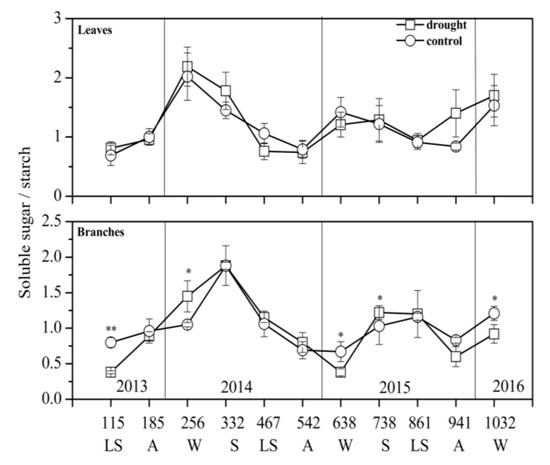 The ratio of soluble sugar to starch in leaves and branches of Pinus massoniana under control and drought treatments (mean ± SD). Samples were collected in late summer (LS), autumn (A), winter (W), and late spring (S) from 2013 to 2016. Variables marked with asterisks indicate a significant difference between the control and drought groups (** p < 0.01, * p < 0.05).