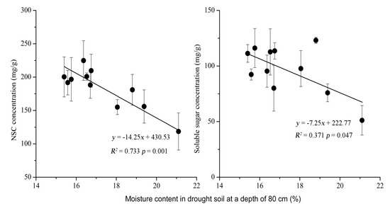 Relationships between NSC concentrations and soluble sugar in leaves and deep soil (80 cm) moisture content in the drought treatment.