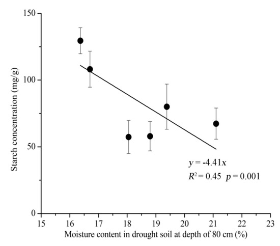 Relationships between concentrations of starch in leaves and deep soil (80 cm) moisture content in the drought treatment for days 115–542.