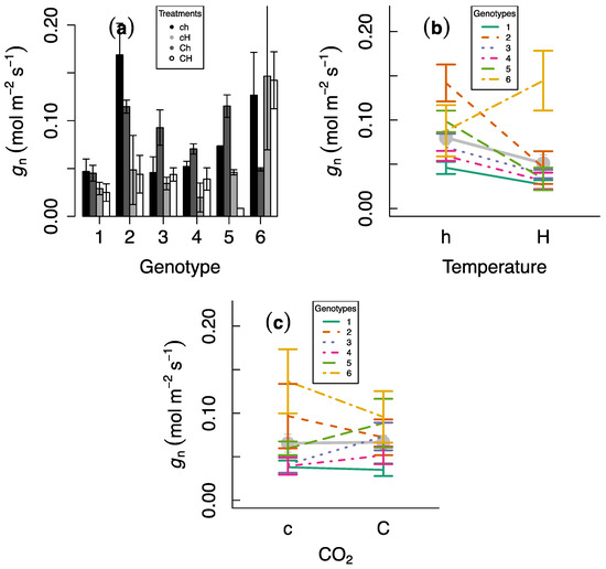 Experimental responses of nocturnal stomatal conductance. (a) Variation across genotypes as a function of heat-wave exposure and CO2 concentrations. (b) Reaction norms of heat-wave responses across genotypes. (c) Reaction norms of CO2 responses across genotypes. Grey in (b,c) indicates average values for all genotypes and the other colors indicate individual genotypes. h, H, c and C indicate no heat-wave exposure, heat-wave exposure, ambient CO2, and elevated CO2, respectively. Error bars indicate standard errors.