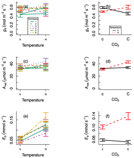 Experimental responses of daytime stomatal conductance (gd; a,b), net photosynthesis (Anet; c,d), and whole plant transpiration (Ep; e,f) in response to no heat-wave exposure (h), heat-wave exposure (H), ambient CO2 (c), and elevated CO2 (C). Data are presented as reaction norms for six genotypes as a function of temperature (figures a,c,e) and as reaction norms for temperature as a function of CO2 treatment (figures b,d,f). Error bars indicate standard errors.