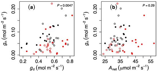 To understand the possible mechanisms explaining the pattern in gn, we correlated this parameter against gd, Anet, and Ep and only observed a significant and positive correlation between gn and gd (P = 0.0047, Figure 3), although the regression had limited explanatory power (R2 = 0.13).